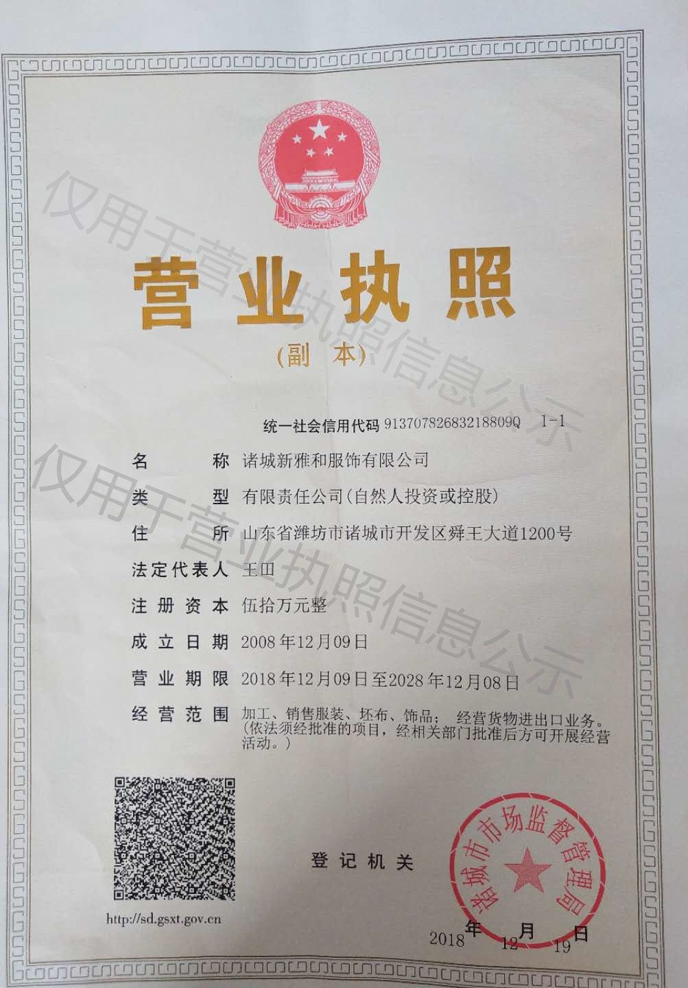 諸城新雅和服飾有限公司的誠信、實(shí)力、產(chǎn)品質(zhì)量、管理團(tuán)隊(duì)獲得業(yè)界及日本眾多客戶的認(rèn)可與贊賞。下一個(gè)五年計(jì)劃,我們將借鑒、學(xué)習(xí)國(guó)內(nèi)外企業(yè)的發(fā)展經(jīng)驗(yàn),積極開發(fā)具有時(shí)尚文化元素、功能性的針織服飾,服務(wù)于社會(huì),服務(wù)于廣大消費(fèi)者;為社會(huì)、為城市、為消費(fèi)者制造并展現(xiàn)美麗、健康、快樂的針織服裝服飾。 公司已經(jīng)通過安全生產(chǎn)標(biāo)準(zhǔn)化管理評(píng)審,成為濰坊地區(qū)安全生產(chǎn)達(dá)標(biāo)企業(yè)。